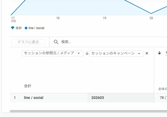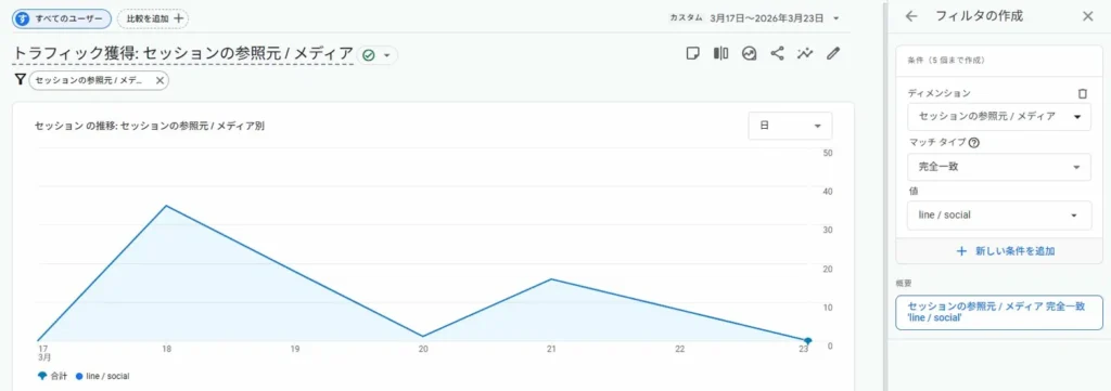 フィルターを適用すると、line / social からのセッションのみが表示されます。