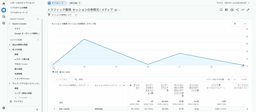 表の「セッションのキャンペーン」列に 2026sale(設定したキャンペーン名)が表示されていれば、正しく計測できています。