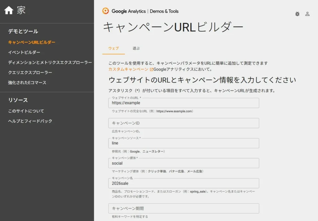 👉 Google Analytics Demos & Tools – キャンペーンURLビルダー
